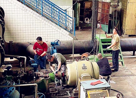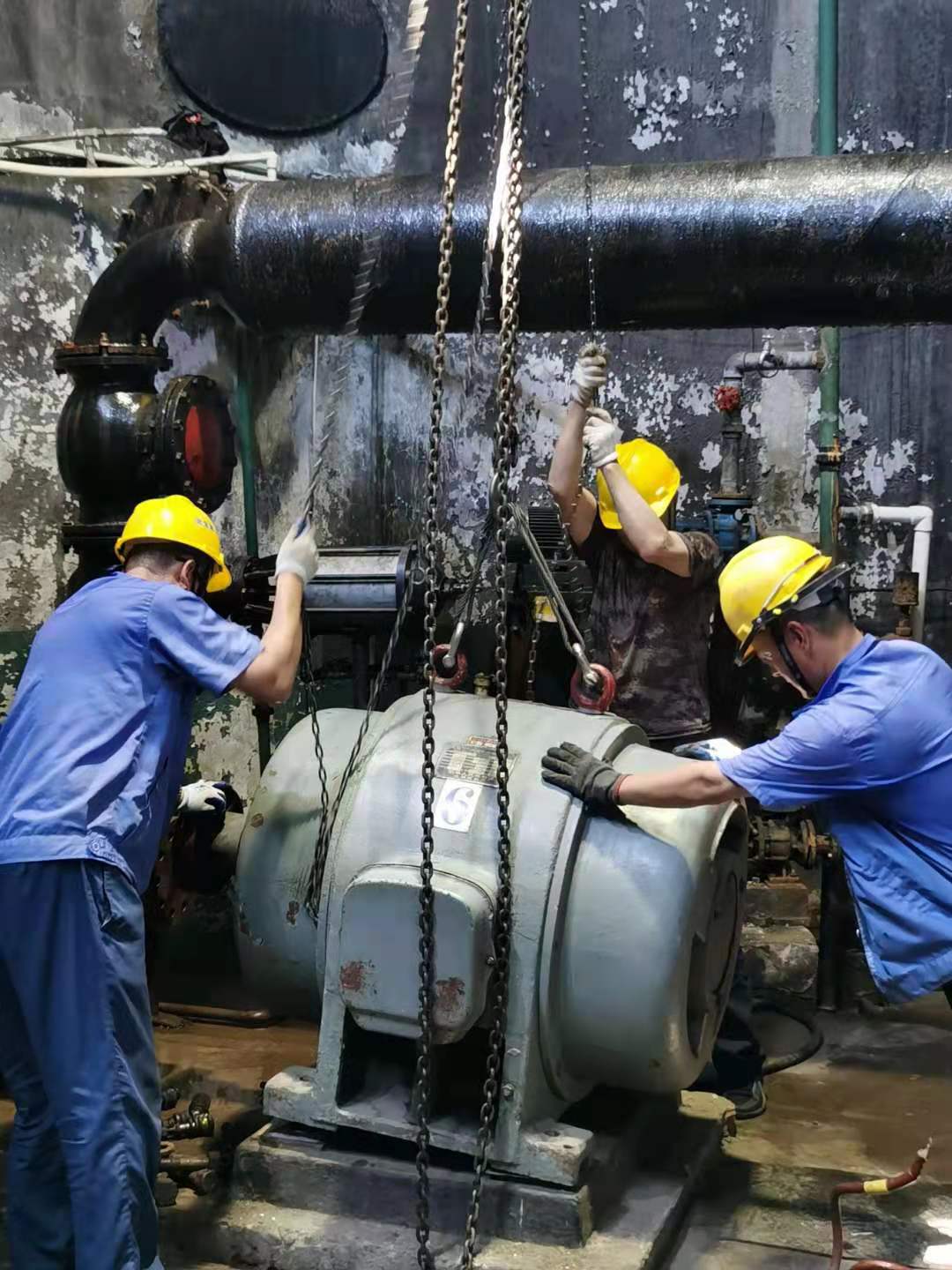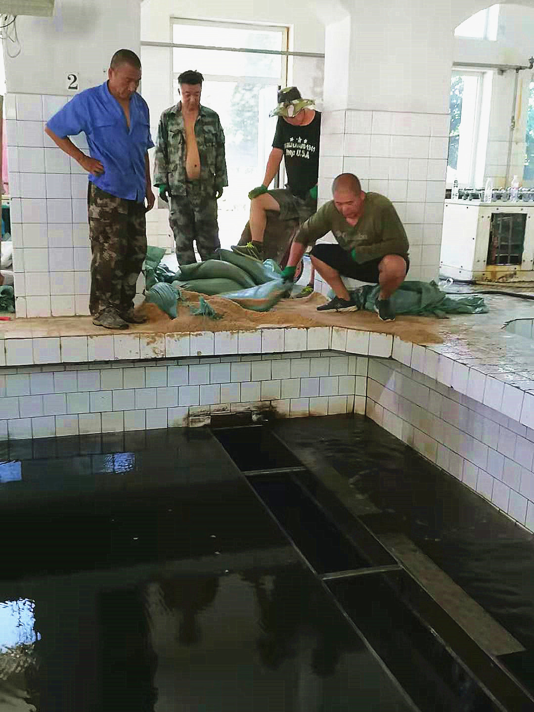 四道溝水源為保證水質(zhì),汛期前對反應(yīng)池沉淀池進(jìn)行清淤工作,對一級泵站設(shè)備進(jìn)行維護(hù)保養(yǎng)大修。由于四道溝水源江心井吸水籠頭損壞,不能有效攔截江中雜物,致使一級泵站取水水泵經(jīng)常堵塞,值班員和維修人員只能打開泵蓋進(jìn)行人工清掏,最多時(shí)每天清掏3次。由于四道溝、SW新運(yùn)轉(zhuǎn)泵站運(yùn)轉(zhuǎn)車間內(nèi)機(jī)組運(yùn)行散發(fā)熱量,致使車間內(nèi)溫度高于室外,最高時(shí)達(dá)到40度,值班員只能強(qiáng)忍高溫,對設(shè)備進(jìn)行操作和維修。維修班更是頂著炎炎烈日完成日常維修,更換接梨樹泵站4號機(jī)組DN150出水水門、更換損壞的接觸器、檢修四道溝水源一泵站3號機(jī)組DN300出水水門。