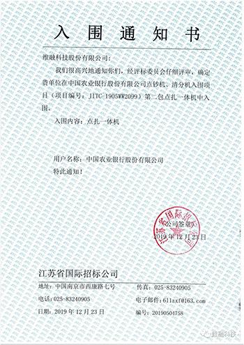 近日,維融科技股份有限公司收到江蘇省國際招標公司發出的《中國農行股份有限公司點鈔機、清分機入圍通知書》(項目編號:JITC-1905WW2099),確定維融科技中標,中標產品包括:人民幣點鈔機、點扎一體機。 維...