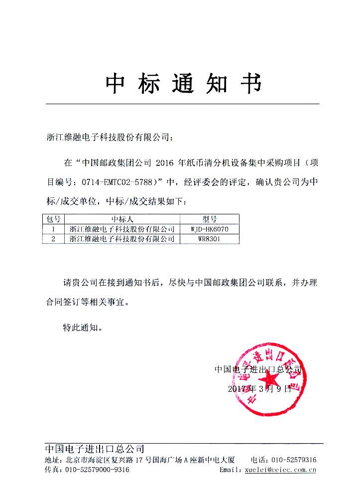 近日,我公司收到中國電子進出口總公司發出的《中標通知書》。在中國郵政集團公司2016年紙幣清分機設備集中采購項目(項目編號:0714-EMTC02-5788)中,經評標委員會的評定,確認維融科技股份有限公司為中標單位,入圍產品為1+1口紙幣清分機、2+1口紙幣清分機。